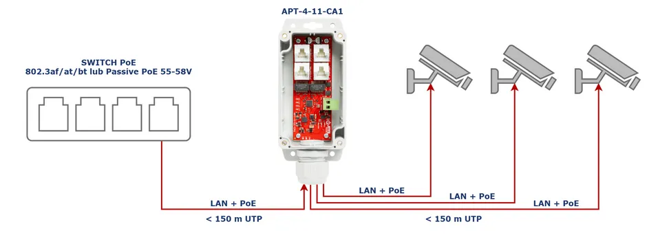 Urządzenie umożliwia nam zasilanie do 3 odbiorników PoE za pomocą jednego przewodu UTP. W sytuacjach, kiedy nie mamy możliwości doprowadzenie nowego przewodu lub doprowadzenie wiązałoby się z dodatkowymi kosztami. APT-4-11-CA1 może pełnić rolę ekstendera sieci LAN + PoE w sytuacji, kiedy odległość pomiędzy urządzeniami przekracza 100m. Jeżeli jest możliwość podzielenia przewodu na odcinki poniżej 100m możemy zastosować APT-4-11-CA1 w celu zwiększenia zasięgu bez konieczności podłączenia dodatkowego zasilania z zachowaniem pełnej przepustowości 100Mbps. Wbudowana funkcja LR150 (Long Range 150m) pozwala na stabilną pracę wszystkich portów do 150 metrów UTP z prędkością 100Mbps oraz zasilaniem PoE. Umożliwi to instalację kamer bez stosowania dodatkowego ekstendera pośredniego dla odległości powyżej 100m.